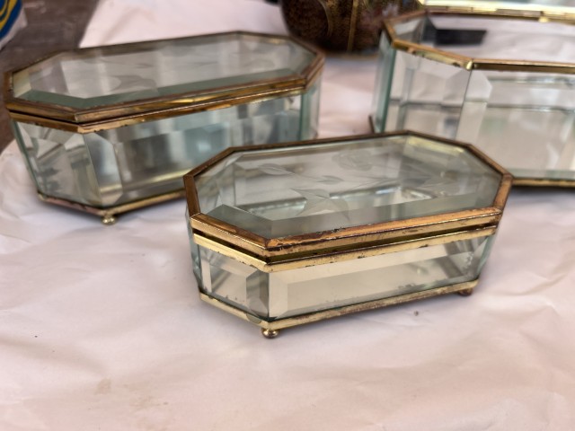 Nest of 3-VTG Octagonal Etched Glass & Brass Jewelry/Trinket Boxes