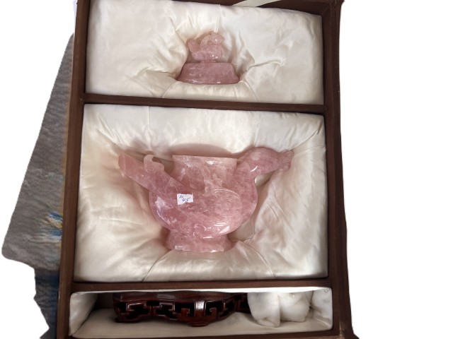 VTG Chinese Rose Quartz Hand Carved Palace Bird Incense Burner