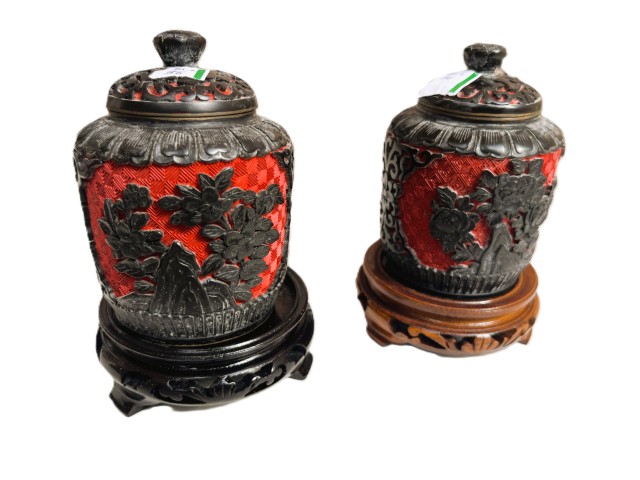 (2) VTG Chinese Carved Black & Red Lacquer Cinnabar Jars 4.5"h, with Lids on Stands