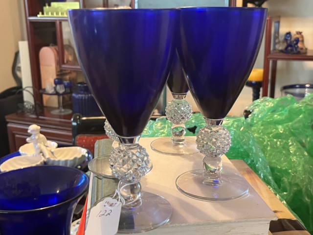 'Ritz' Cobalt Blue, Clear Glass Golf Ball Stem Glasses, 1930's-1950;s