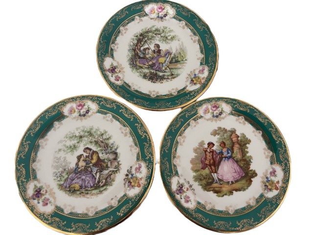 (3) Antique Green Rim Hand Decorated Limoges Plates